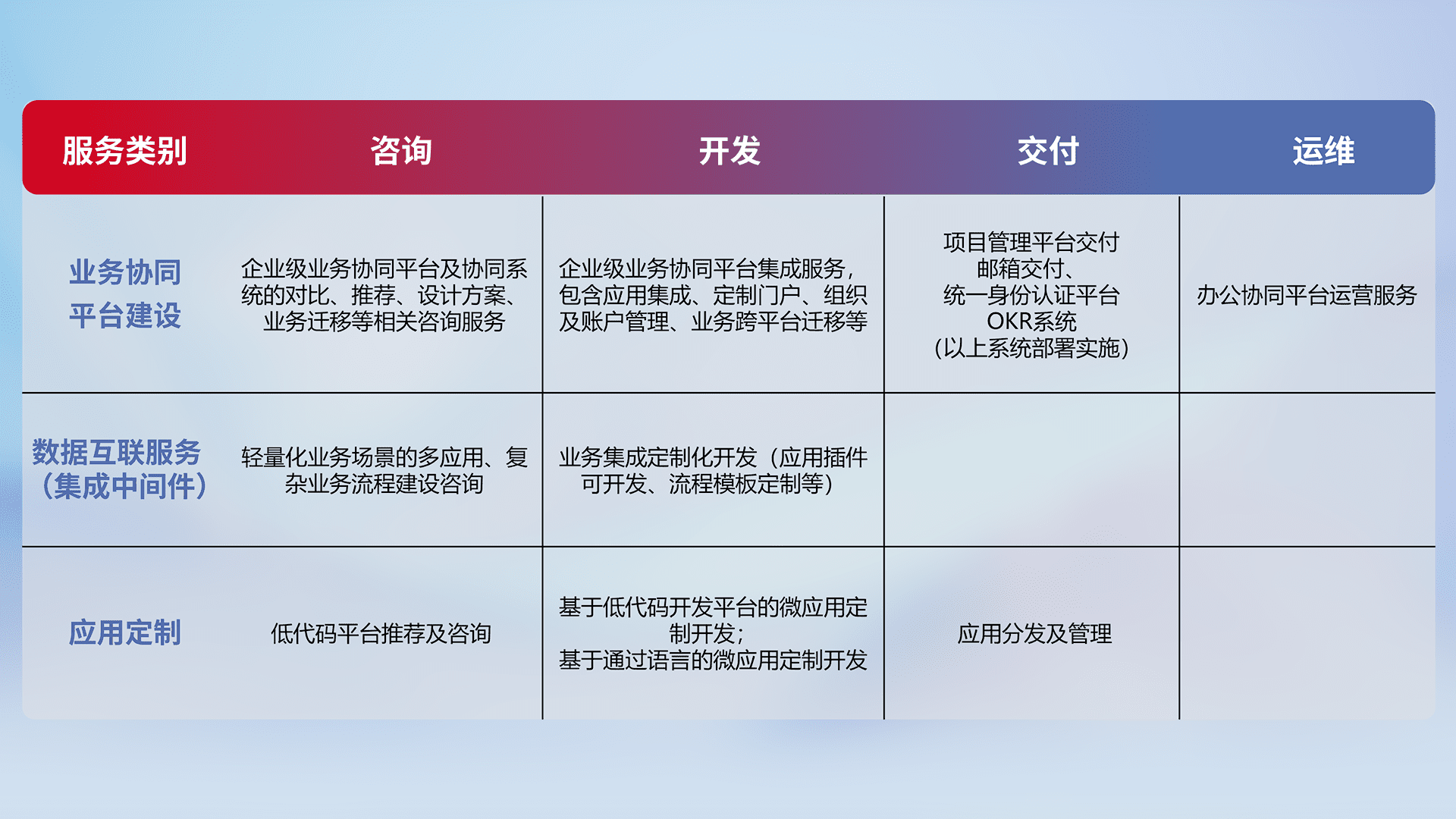 针对钉钉、、、企微、、IDaas等平台级产品提供产品的规划、、方案、、、交付、、定制化开发等服务,,实现如统一协同办公、、智能客户服务、、、混合会议管理、、、智能数据查询、、、、等业务场景,,,实现数字化转型。。